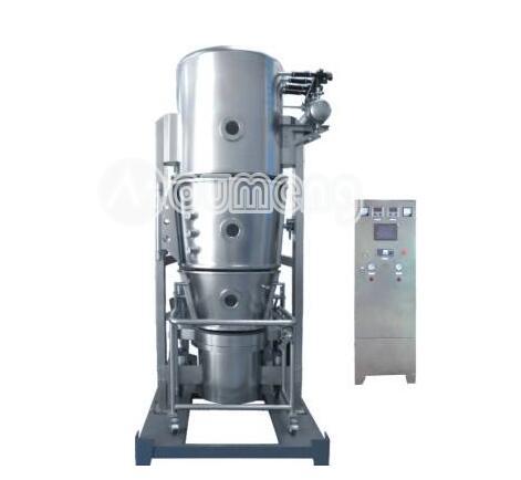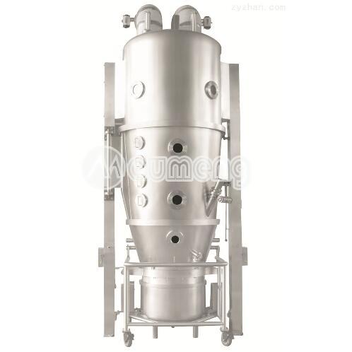 物料粉末粒子,在原料容器(流化床)中呈環(huán)形流化狀態(tài),受到經(jīng)過(guò)凈化后的加熱空氣預(yù)熱和混合,將粘合劑溶液霧化噴入,使若干粒子聚集成含有粘合劑的團(tuán)粒,由于熱空氣對(duì)物料的不斷干燥,使團(tuán)粒中水分蒸發(fā),粘合劑凝固,此過(guò)程不斷重復(fù)進(jìn)行,形成理想的、均勻的多微孔球狀顆粒。